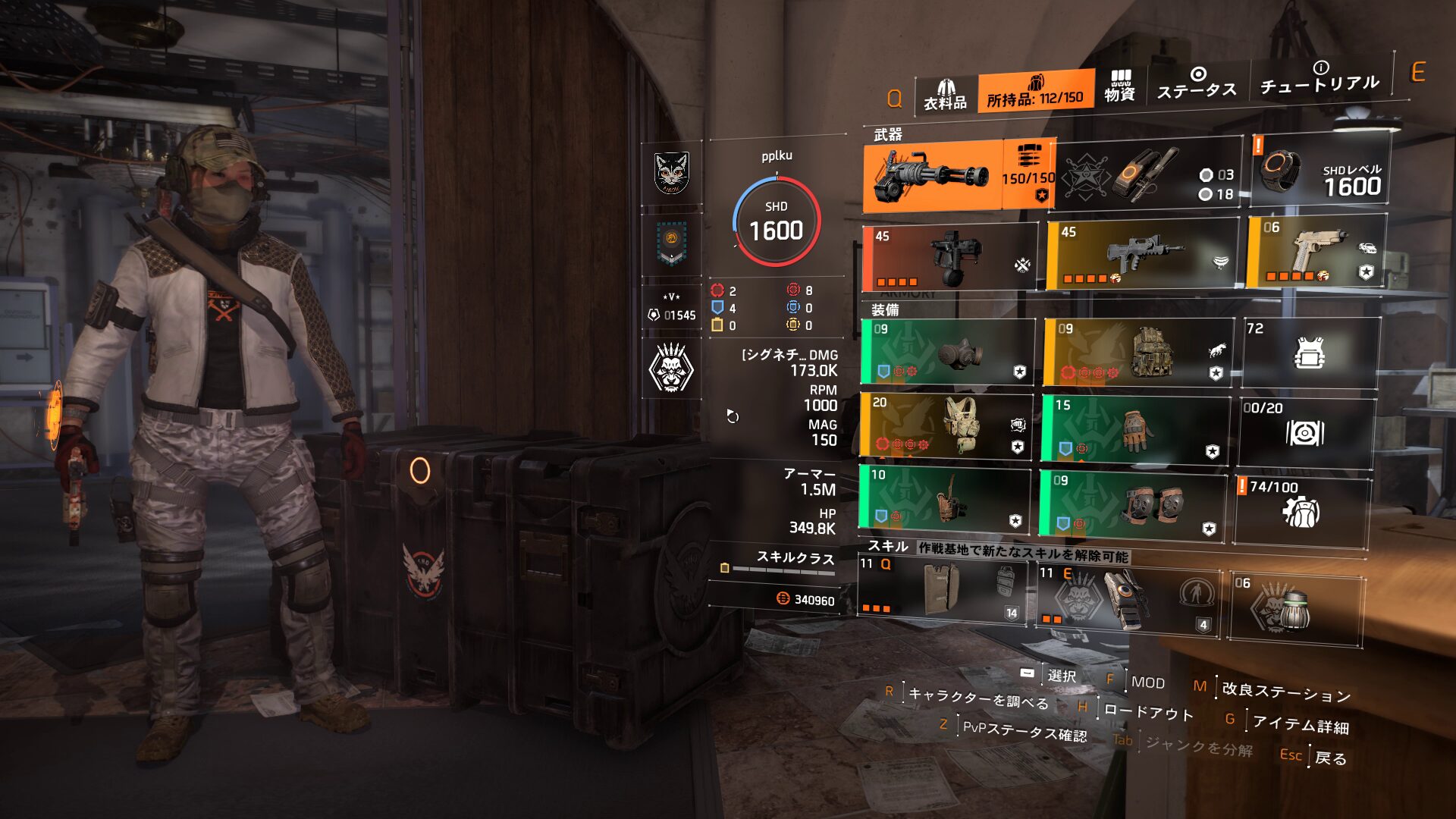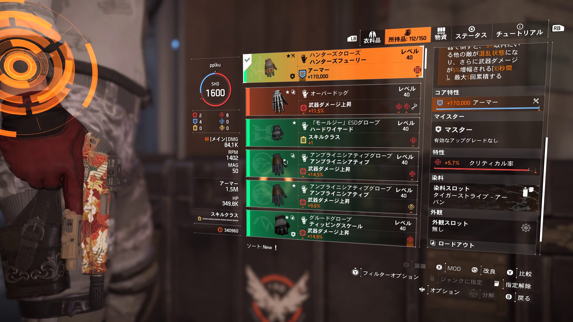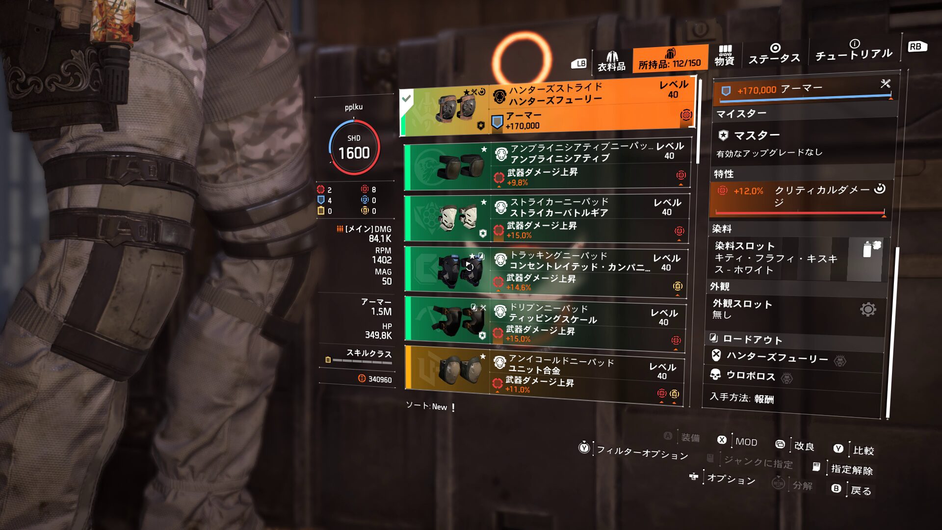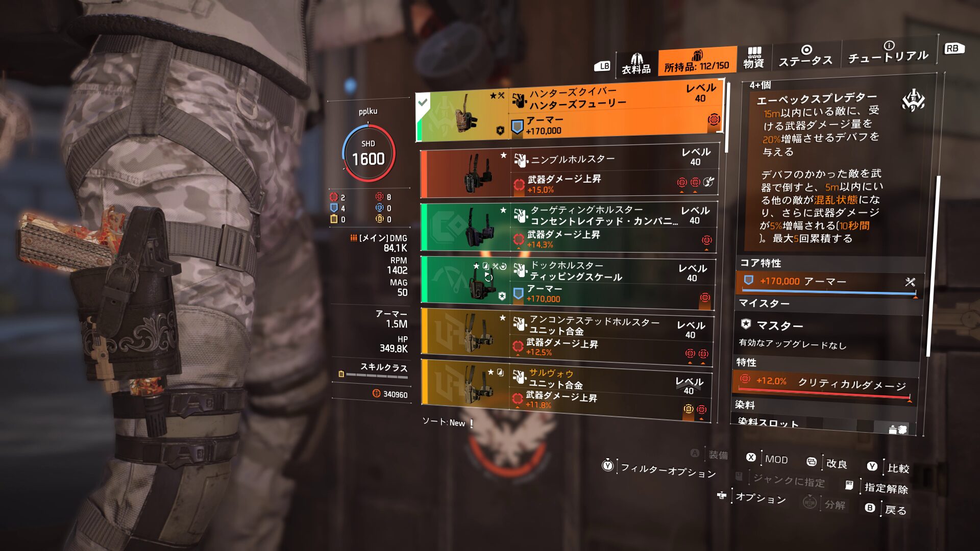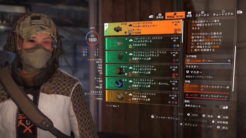 本来なら、以下で詳しく触れますが、今回ハンターズフューリーで組んでいますのでショットガンを持たせたほうがビルドの構成的に良いと思います(ハンターズフューリー2部位でショットガンダメージ+15%)。