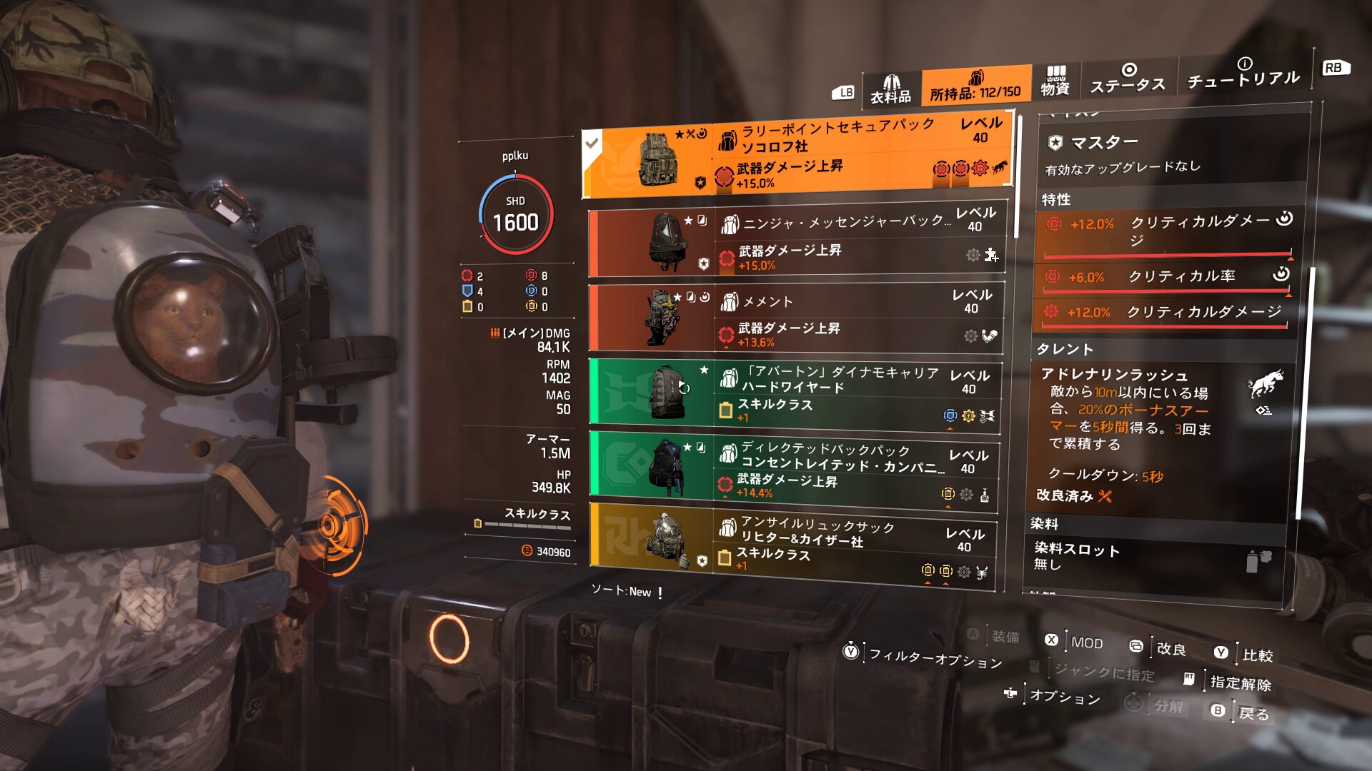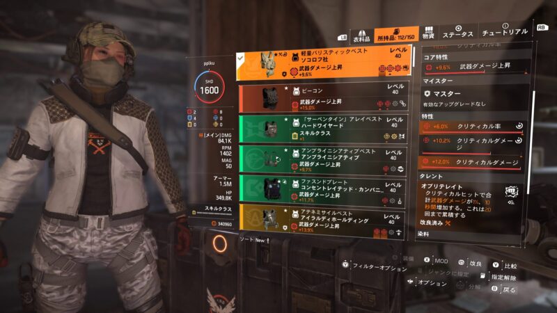バックパックのタレントをアドレナリンラッシュにしていますが、必ず近づいて戦うと決めているのであればボディをオブリテレイトからインティミデイト(ボーナスアーマー発生時に攻撃力UP)に変えるのもありかもしれません。(どっちが強いかは未検証)